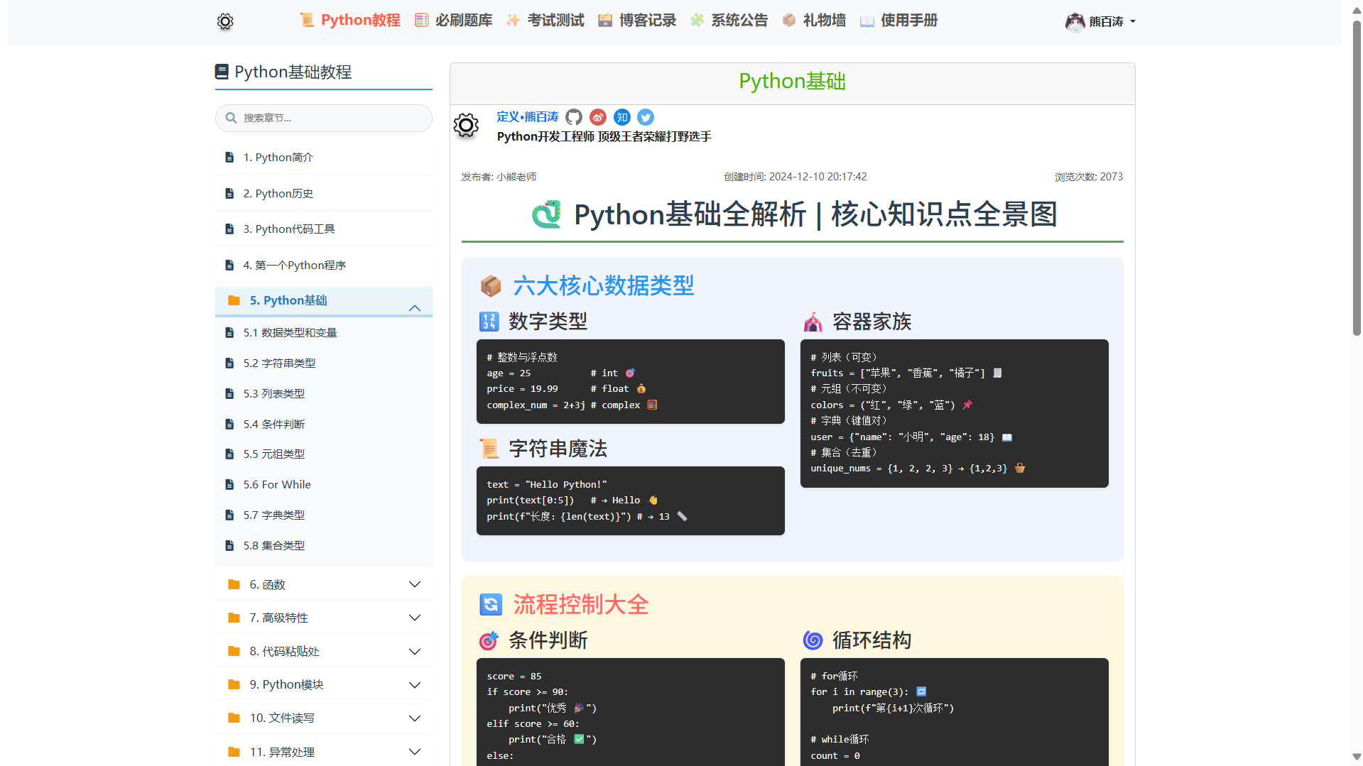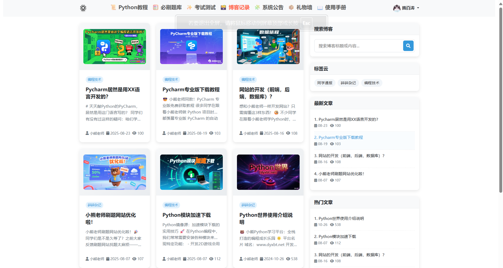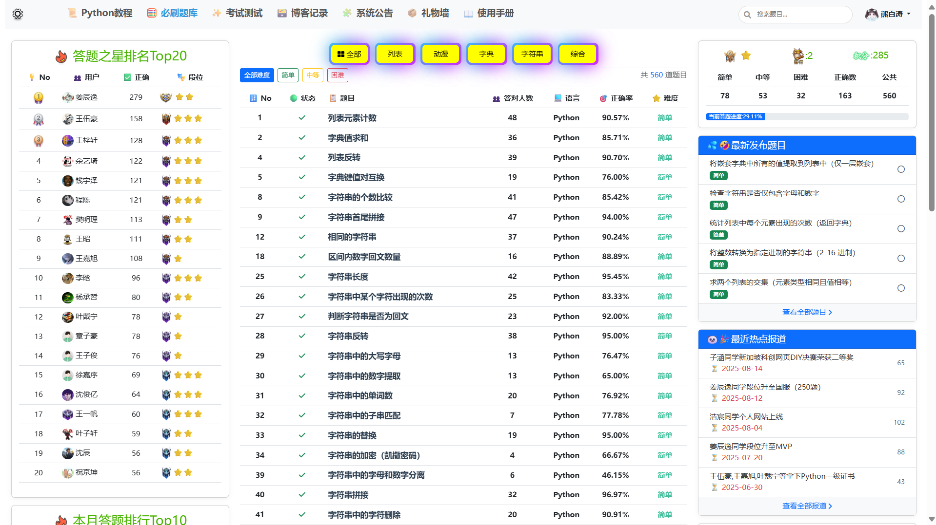 作为作者(熊百涛)从后端开发转型编程培训(少儿编程)期间的其一成果,“Python世界”网站专为青少年Python学习者打造,整合了题库、教程、考试练习等多元资源,旨在降低学习门槛、提升学习效率。以下为你详细介绍平台核心功能、未来规划及适用人群,助你快速开启编程学习之路。