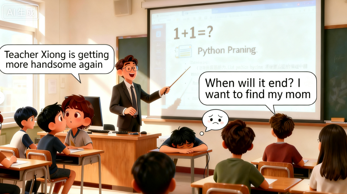 Teacher Xiong: Great job!(很好) You all now know the difference between print('1+1') (outputs a string) and print(1+1) (outputs the calculation result 2). Now, let’s step it up—what will print(1+'1') give?