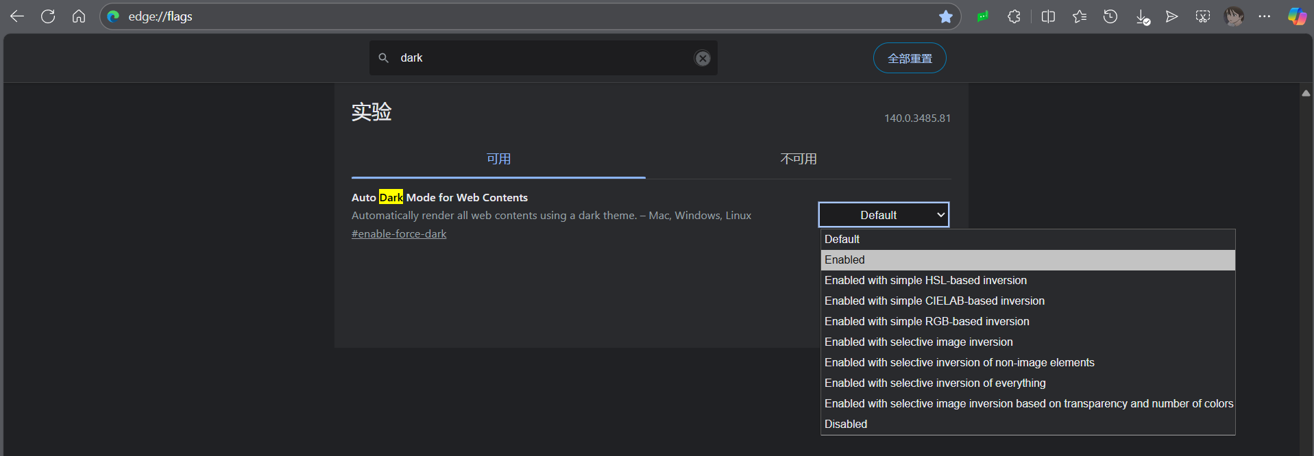 edge://flags/ - 在搜索框输入“dark”